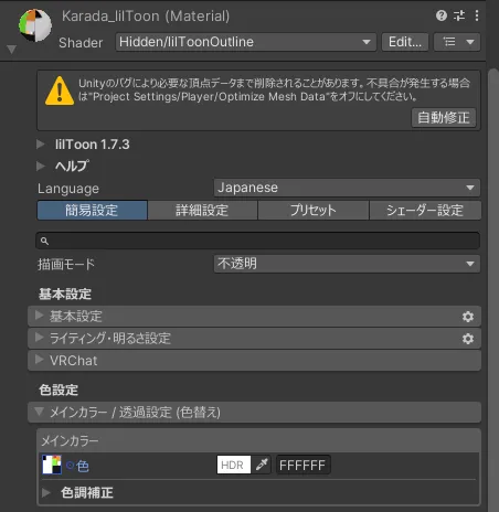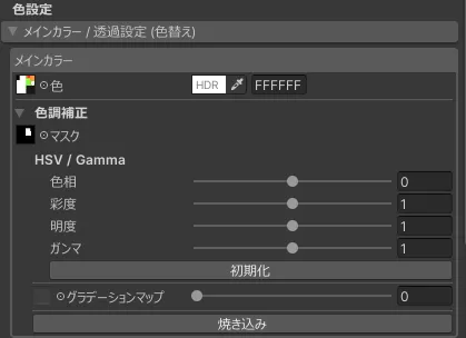 下のShaderと書いてあるところを開いて、色設定→メインカラー/透過設定(色変え)と続けて開いていきます。